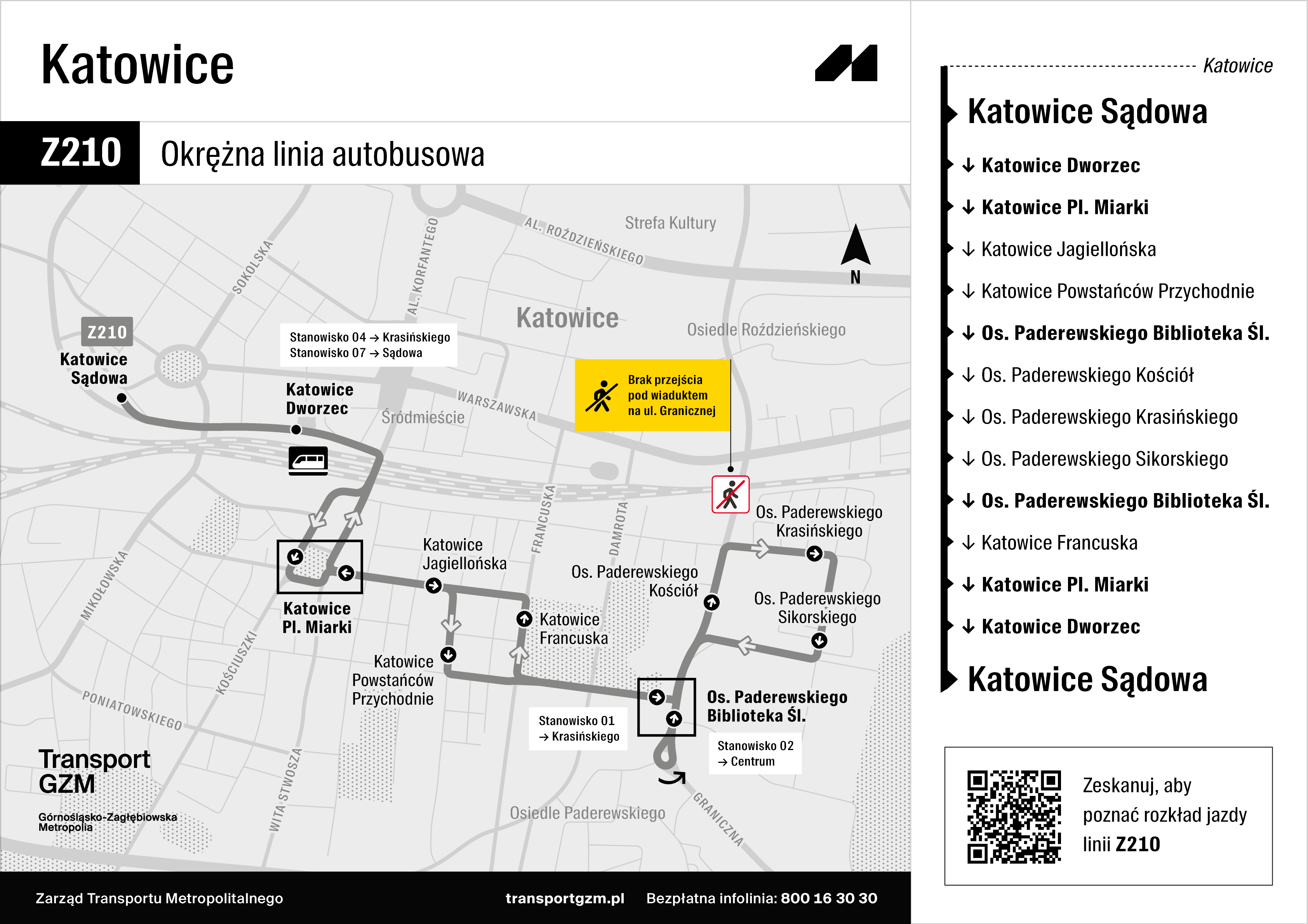 Tymczasowa linia Z210 na czas zamknięcia przejścia pod wiaduktem nad ul. Graniczną w Katowicach
