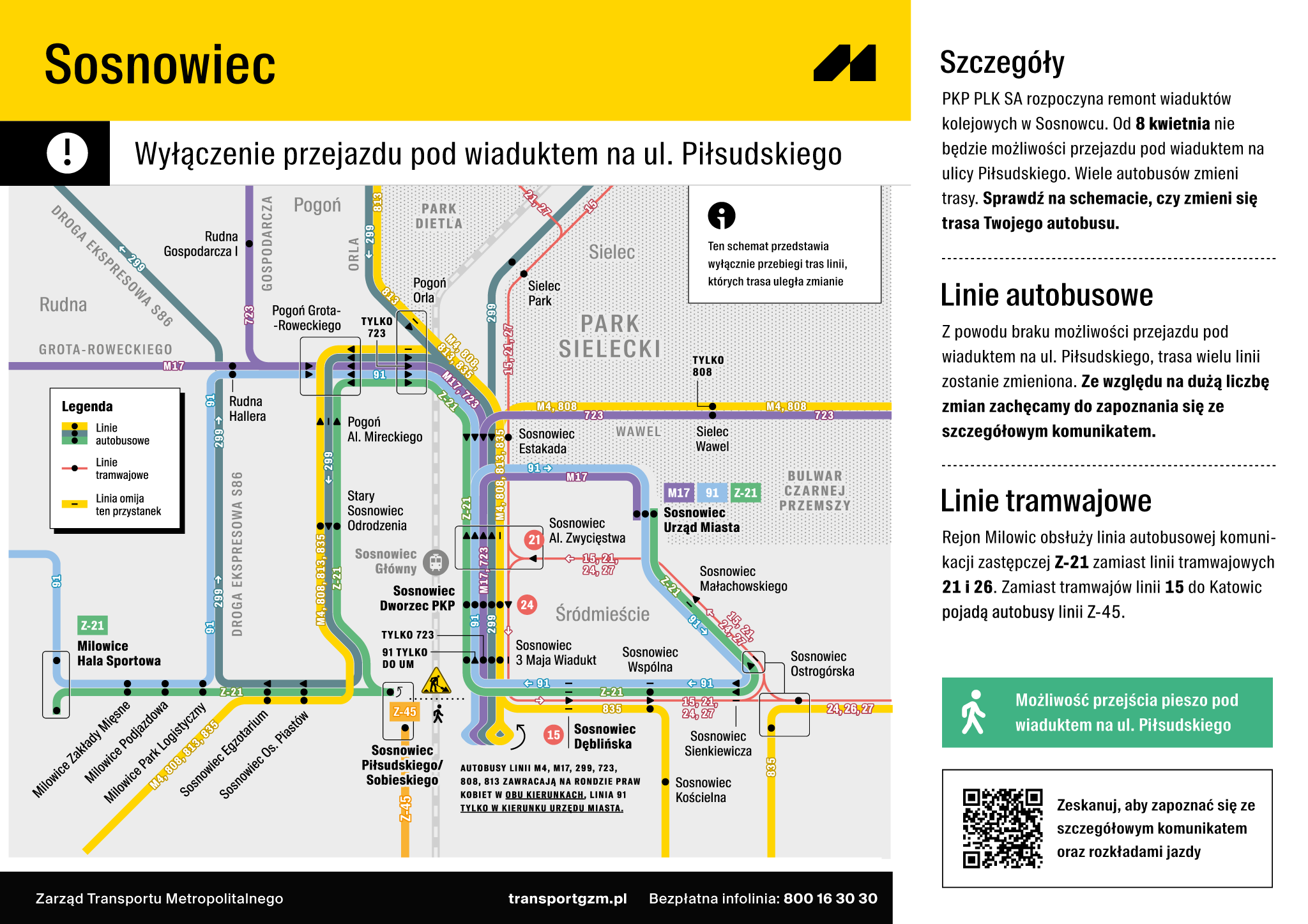 W związku z realizacją przez PKP PLK S.A. remontu wiaduktu kolejowego w ciągu ul. Piłsudskiego (w Rejonie Ronda Praw Kobiet) i związanym z tym wyłączeniem możliwości przejazdu pod nim od 8 kwietnia 2026 r. obowiązywać będą zmiany w funkcjonowaniu komunikacji miejskiej: