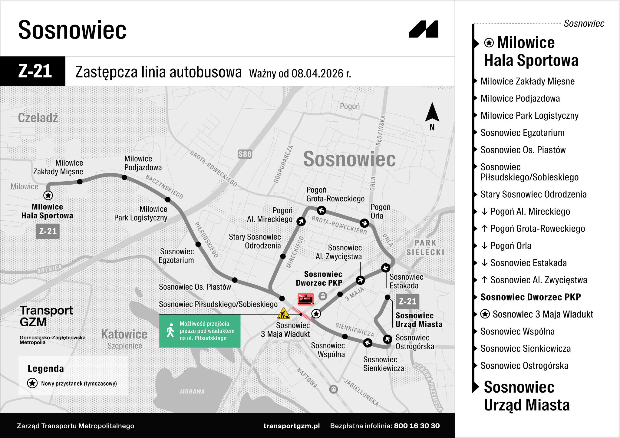 · Uruchomiona zostanie linii autobusowej komunikacji zastępczej Z-21 na trasie Milowice Hala Sportowa – Sosnowiec Urząd Miasta (przez Pogoń)
